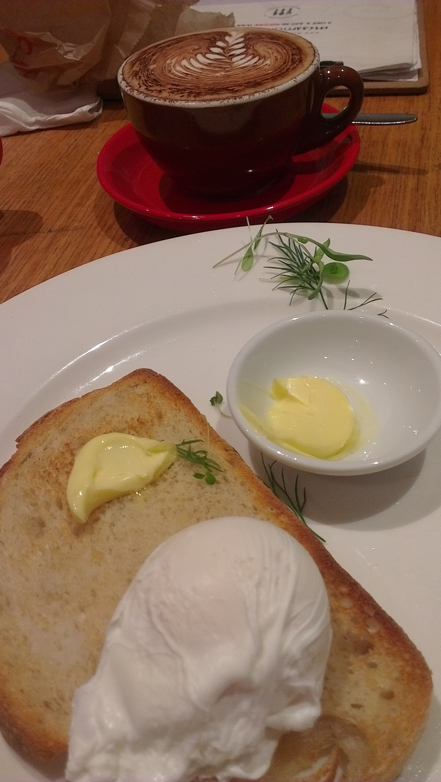 To the damn food, you say. From the kid’s menu, with the omission of the bacon, I got egg on toast for baby girl